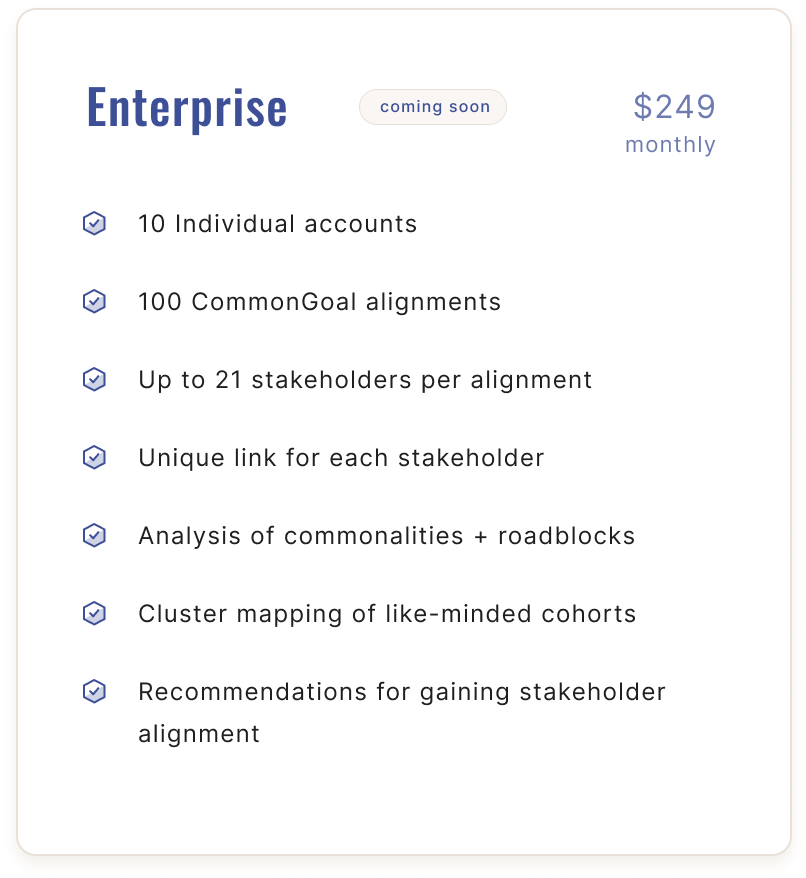 Packages are based on number of team members initiating alignments and stakeholders offering their perspective: up to 7 in Pro and up to 21 in Corp per alignment. Corp accounts also include expanded visualization, video and negotiation guides.